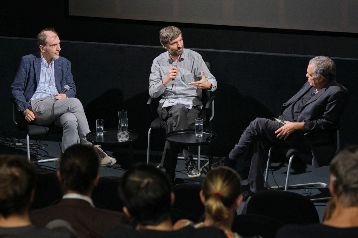 In Kooperation mit dem Jüdischen Museum Wien und anlässlich der Ausstellung G*tt. Die großen Fragen zwischen Himmel und Erde, die dort noch bis 5. Oktober 2025 zu sehen ist, zeigten wir Amos Gitais Beitrag zum Omnibusfilm Words with Gods. Im Anschluss an die Vorführung von Book of Amos diskutierten Amos Gitai und der Co-Kurator der Ausstellung, Domagoj Akrap, im Gespräch mit Jurij Meden. Den gedanklichen Bogen schlug zuvor Kuratorin Daniela Schmid, die in ihrer Einführung die Themen der Ausstellung mit Gitais Werk in Dialog brachte.